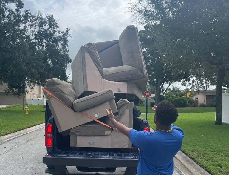 Instead of stress or delay, Tiny Muscle Movers & Junk Removal stepped in with calm reassurance and a plan. Our experienced team secured the oversized couch using professional-grade straps, implemented safe driving techniques, and even assigned a flagger vehicle to follow behind for full visibility and compliance.